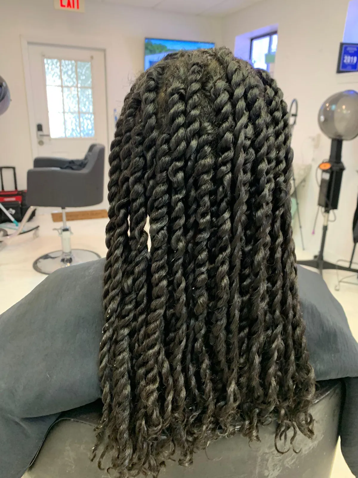 Twist me ( not for new clients) Medium two strand twist individual no added hair includes complete shampoo service service . Done on damp hair 2hours @ $245.00